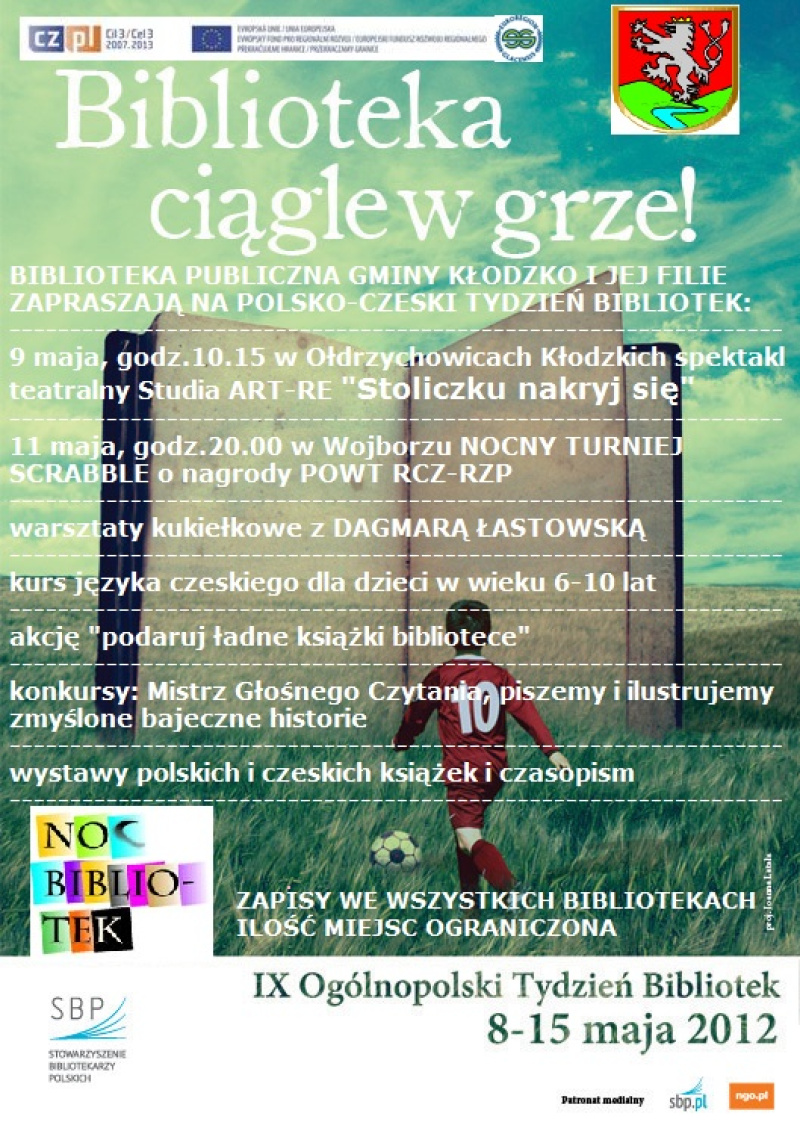 8-15 maja 2012 roku Biblioteka Publiczna Gminy Kłodzko zaprasza na Polsko-Czeski Tydzień Bibliotek. W każdej bibliotece: warsztaty kukiełkowe z Dagmarą Łastowską, kurs języka czeskiego dla dzieci w wieku 6-10 lat, konkursy Mistrz Głośnego Czytania, piszemy i ilustrujemy zmyślone bajeczne historie, Nocny Turniej Scrabble, wystawy czeskich książek i czasopism, akcja "podaruj ładne książki bibliotece" oraz spektakl teatralny "Stoliczku nakryj się".