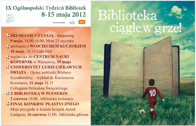 BIBLIOTEKA PUBLICZNA MIASTA I GMINY W ŚREMIE ZAPRASZA DZIECI, MŁODZIEŻ I DOROSŁYCH NA HAPPENING pt. ŚREMIANIE CZYTAJĄ. W DNIU 9 MAJA 2012 W GODZINACH 14.00-16.00 NA MOŚCIE NA WARCIE POKAŻMY ŻE JESTEŚMY CZYTAJĄCYMI LUDŹMI! PRZYJDŹ Z WŁASNĄ KSIĄŻKĄ, GAZETĄ, KOMIKSEM, INFORMATOREM, BROSZURĄ, LAPTOPEM, E-BOOKIEM, AUDIOBOOKIEM, KSIĄŻKĄ W ALFABECIE BRAILLE’A LUB CZYMKOLWIEK DO CZYTANIA I POZOSTAŃ Z NAMI. WSZYSCY CZYTAMY. CZYTAMY W RÓŻNYCH MIEJSCACH: W SZKOLE, DOMU, ŁÓŻKU, W PARKU, W KOLEJCE, PODRÓŻY – DLACZEGO WIĘC NIE NA MOŚCIE? PO CO? ŻEBY UDOWODNIĆ ŻE ŚREMIANIE CZYTAJĄ. DOWODEM BĘDĄ ZDJĘCIA, KTÓRE ZROBIMY PODCZAS HAPPENINGU I POKAŻEMY JE W BIBLIOTECE, KTÓRA W TYM ROKU OBCHODZI SWOJE 65 - LECIE. A PRZYNIESIONE KSIAŻKI DO CZYTANIA MOŻECIE POZOSTAWIĆ PRZED BIBLIOTEKĄ. PANIE BIBLIOTEKARKI NA PEWNO SIĘ NIMI ZAOPIEKUJĄ. ZAPRASZAMY !!!!!!!!!