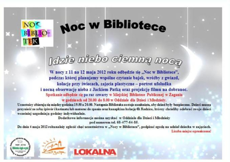 - Noc w Bibliotece – Idzie niebo ciemną nocą - (11 maja 2011 r., godz. 20.00, Oddział dla Dzieci i Młodzieży). W programie:
