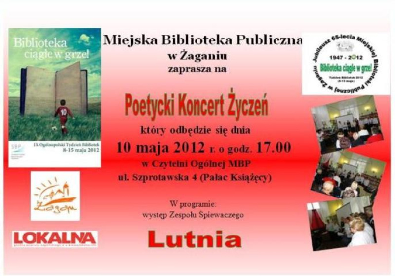 - Poetycki Koncert Życzeń – wieczór literacki (10 maja 2011 r., godz. 17.00, Czytelnia Ogólna przy Oddziale dla Dorosłych). W programie występ zespołu „Lutnia”.