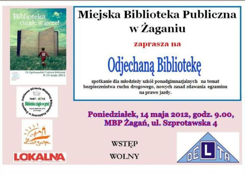 - Odjechana Biblioteka – spotkanie dla młodzieży szkół ponadgimnazjalnych na temat bezpieczeństwa ruchu drogowego, nowych zasad zdawania egzaminu na prawo jazdy – prowadzący instruktor jazdy ze Szkoły Nauki Jazdy z Żagania.