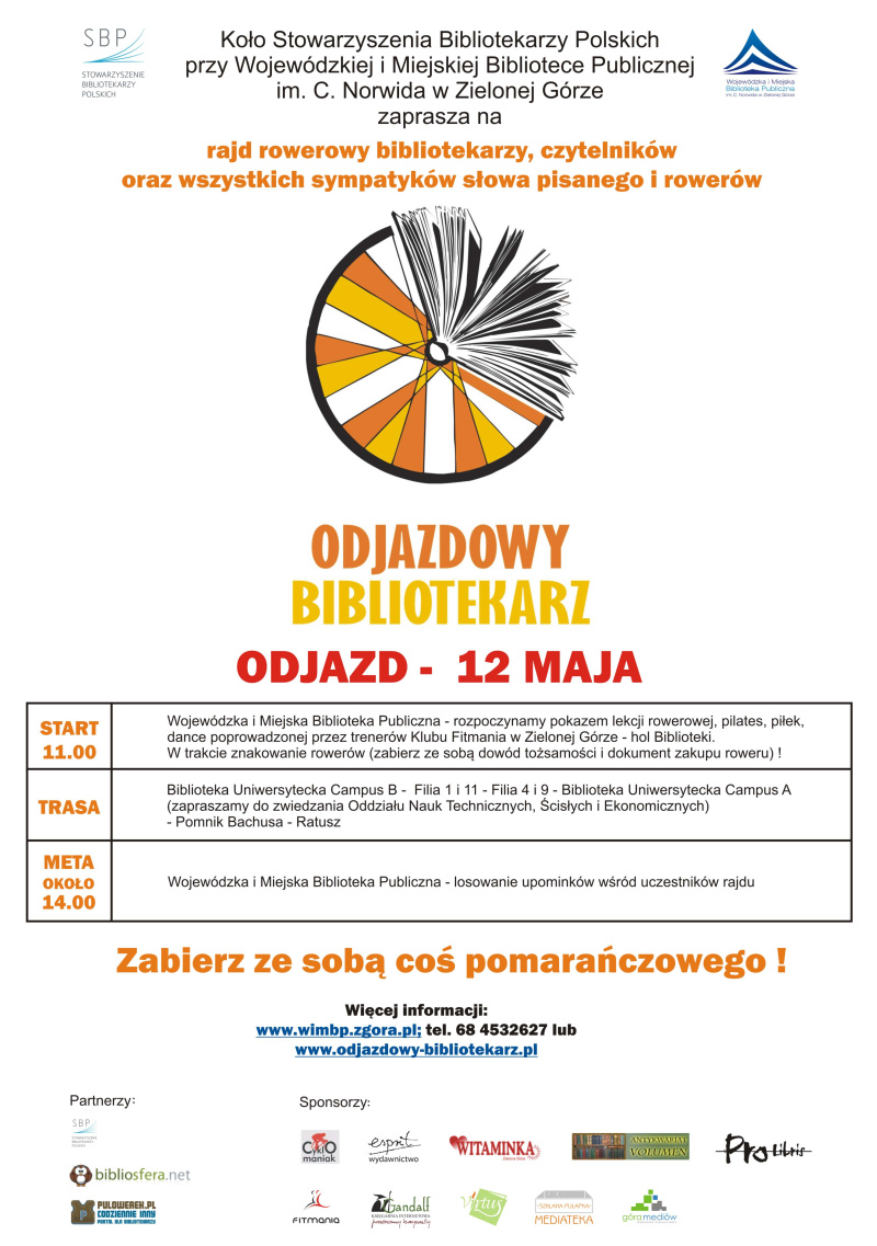 Koło Stowarzyszenia Bibliotekarzy Polskich i WiMBP w Zielonej Górze, zaprasza czytelników oraz wszystkich miłośników książki, bibliotek i rowerów do udziału w drugiej w naszym mieście, a trzeciej w Polsce edycji rajdu rowerowego „Odjazdowy Bibliotekarz”. Rajd organizowany w ramach Tygodnia Bibliotek, odbędzie się 12 maja 2012 roku o godz. 11.00. Zaczynamy przed Biblioteką Norwida, gdzie będzie można oznakować rower oraz zapoznać się z działaniem różnych sprzętów fitness. Następnie odwiedzimy filie miejskie WiMBP (nr 1 i 4), a także Biblioteki Uniwersytetu Zielonogórskiego. Rajd zakończy się przed Norwidem gdzie odbędzie się loteria z ciekawymi nagrodami.