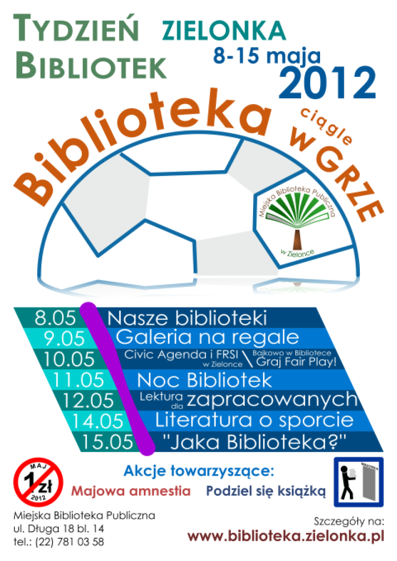 Zachęcam do zapoznania się z harmonogramem imprez zorganizowanych w Miejskiej Bibliotece Publicznej w Zielonce z okazji „Tygodnia Bibliotek 2012” (8-15 maja). Szczegóły (imprezy główne i towarzyszące) na stronie internetowej biblioteki www.biblioteka.zielonka.pl.Zapraszam - Iwona Orzechowska,Dyrektor Miejskiej Biblioteki Publicznej w Zielonce.