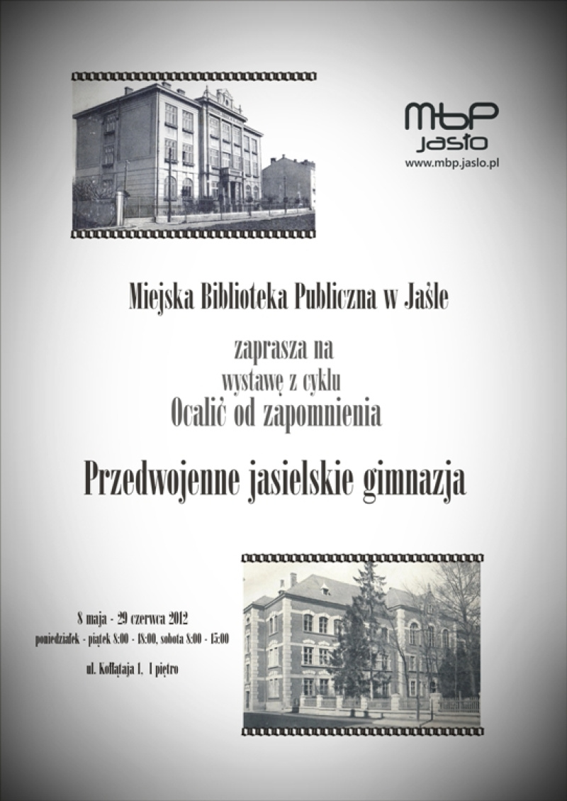 Miejska Biblioteka Publiczna w Jaśle zaprasza na wystawę „Przedwojenne jasielskie gimnazja” z cyklu - Ocalić od zapomnienia. Wystawa prezentuje historię dwóch jasielskich gimnazjów: Państwowego Gimnazjum im. Króla Stanisława Leszczyńskiego i Prywatnego Gimnazjum Żeńskiego im. Błogosławionej Jolanty do roku 1939.