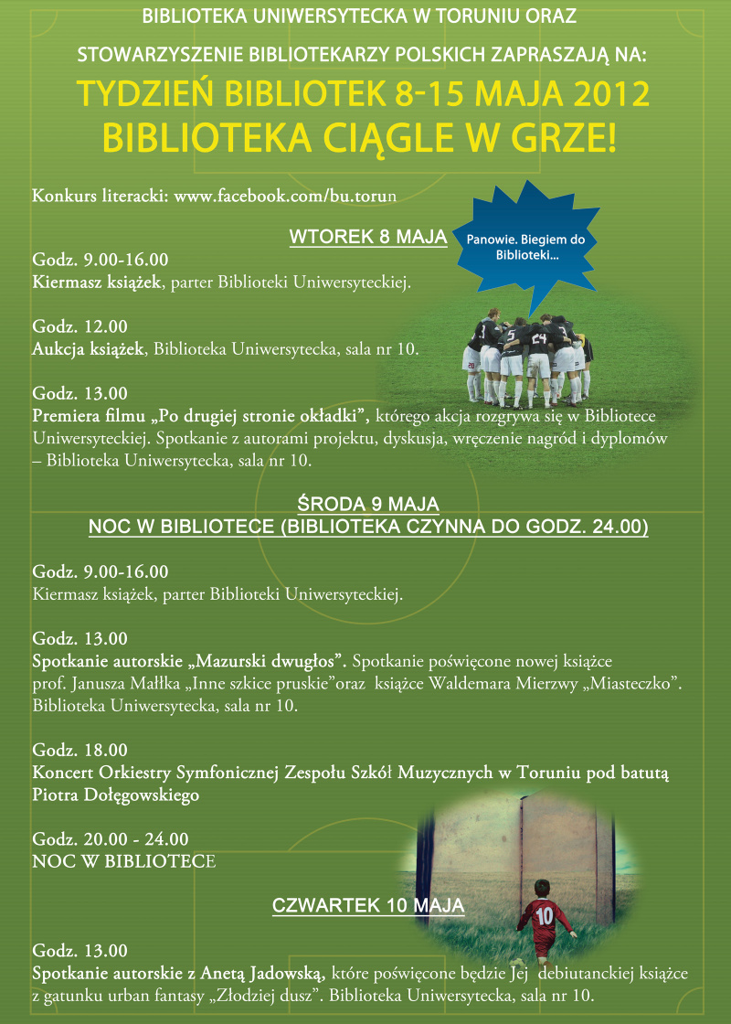 13.00 Biblioteka Uniwersytecka, sala nr 10- premiera filmu: „Po drugiej stronie okładki” którego akcja rozgrywa się w Bibliotece Uniwersyteckiej. Spotkanie z autorami projektu, dyskusja, wręczenie nagród i dyplomów.