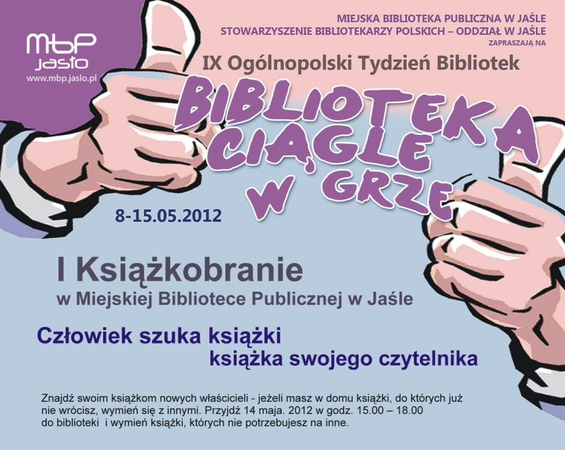 „Człowiek szuka książki – książka swego czytelnika. Nie czytasz - wymień się książką”.14 maja 2012 r. w godzinach 15.00-18.00 Miejska Biblioteka Publiczna w Jaśle zaprasza na akcję „Książkobranie - znajdź swoim książkom nowego właściciela”, w ramach IX Ogólnopolskiego Tygodnia Bibliotek.