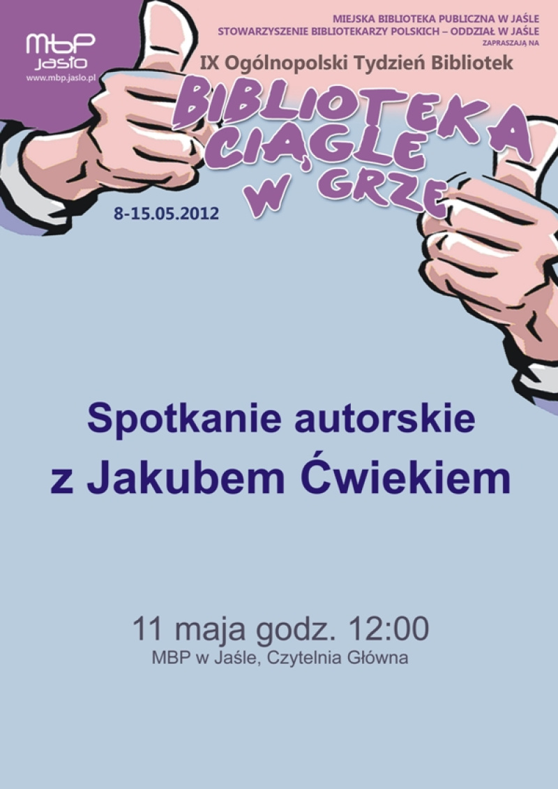 11 maja 2012 r. Miejska Biblioteka Publiczna w Jaśle zaprasza w ramach IX Ogólnopolskiego Tygodnia Bibliotek na spotkanie z Jakubem Ćwiekiem, pisarzem i scenarzystą.