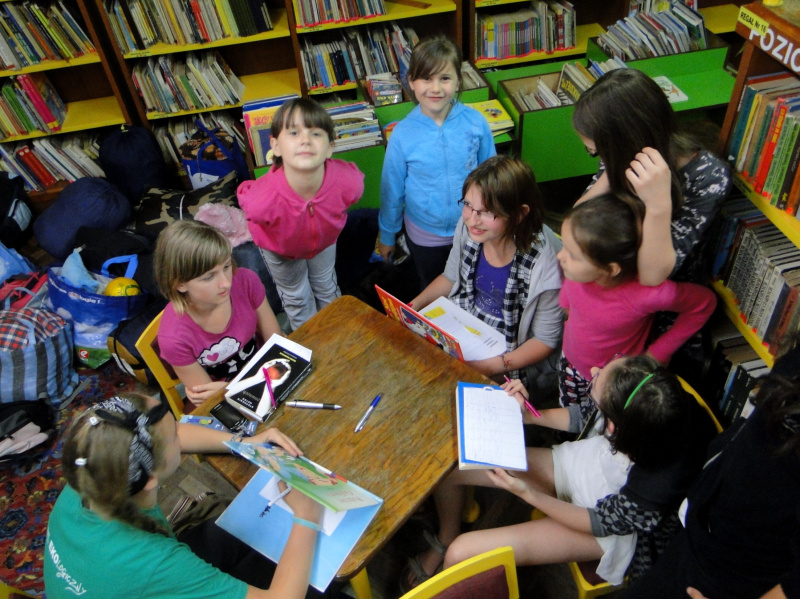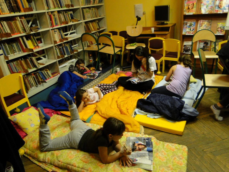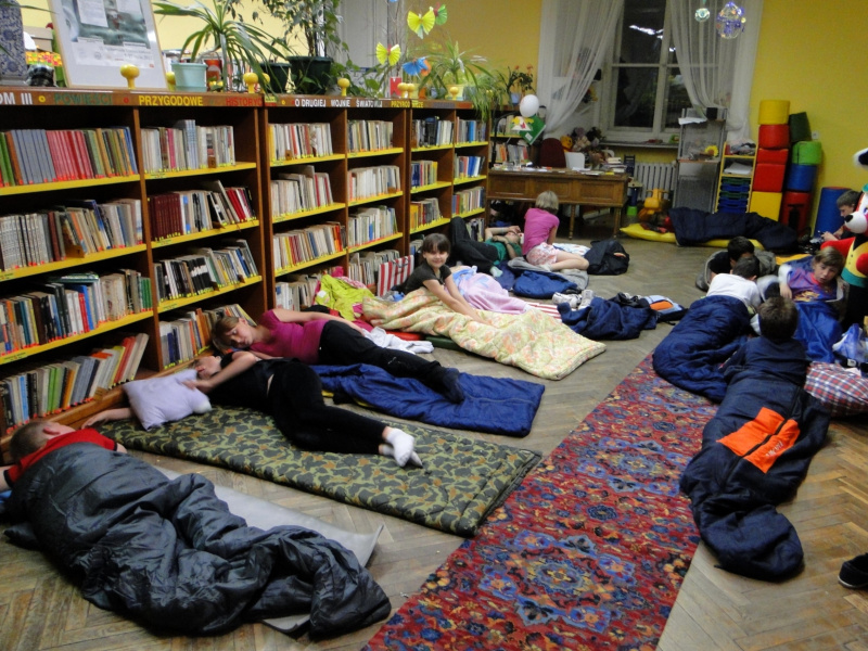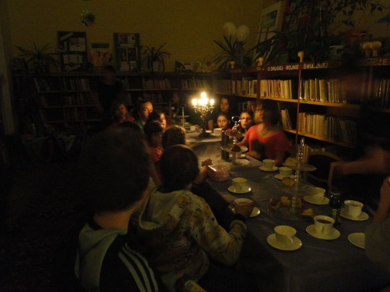 Oddział dla Dzieci i Młodzieży Miejskiej Biblioteki Publicznej w Żaganiu mieszczącej się w pomieszczeniach Pałacu Książęcego z XVII w., w nocy z 11 na 12 maja 2012 roku tętnił życiem, gwarem i dobrą zabawą. Rozpoczęliśmy o godzinie 20.00, dzieci z całym wyposażeniem pojawiły się punktualnie, przynosząc ze sobą dobre humory. Początek spotkania upłynął na integrowaniu się i przedstawieniu kolejnych punktów programu. Po części oficjalnej przyszedł czas na dobrą zabawę (gry planszowe, malowanie, wymyślanie niesamowitych historii). Nikt nawet nie zauważył, że to już godz. 21.00 i pora na wieczorny posiłek. Kolacja odbyła się przy świecach, miło było patrzeć na uśmiechnięte buzie, niejednokrotnie wysmarowane marmoladą, masłem z pałaszowanych bułeczek. Po kolacji nastąpiło nocne zwiedzanie komnat pałacowych, za oknami w tym czasie szalała burza i padał obfity deszcz. W pewnym sensie sama natura stworzyła nam klimat grozy i tajemniczości, ale również pokrzyżowała plany. Nie odbyła się nocna obserwacja nieba z Jackiem Patką, ale dzieci nic na tym nie straciły, ponieważ pan Jacek pojawił się z prezentacją multimedialną. Wspaniale opowiadał, a zaczął od starożytnych twierdzeń filozofów o budowie wszechświata. Bardzo dużo informacji przekazał o Janie Keplerze, o jego teoriach i badaniach. Spotkanie wzbudziło ogromne zainteresowanie, padało dużo pytań: czy istnieje życie na innych planetach? Czy jest możliwe poruszanie się w czasoprzestrzeni? Kiedy o godz. 3.00 nad ranem większość dzieci wcale nie miała ochoty na sen, młodsze z nich oglądały bajki, starsze czytały fragmenty powieści Kuszona Cast P.C oraz Hera królowa bogów i żona idealna Colloredo S. Na spanie zbyt wiele czasu nie było, rano dzieci poszły do swoich domów z ogromnym żalem, że to już koniec.