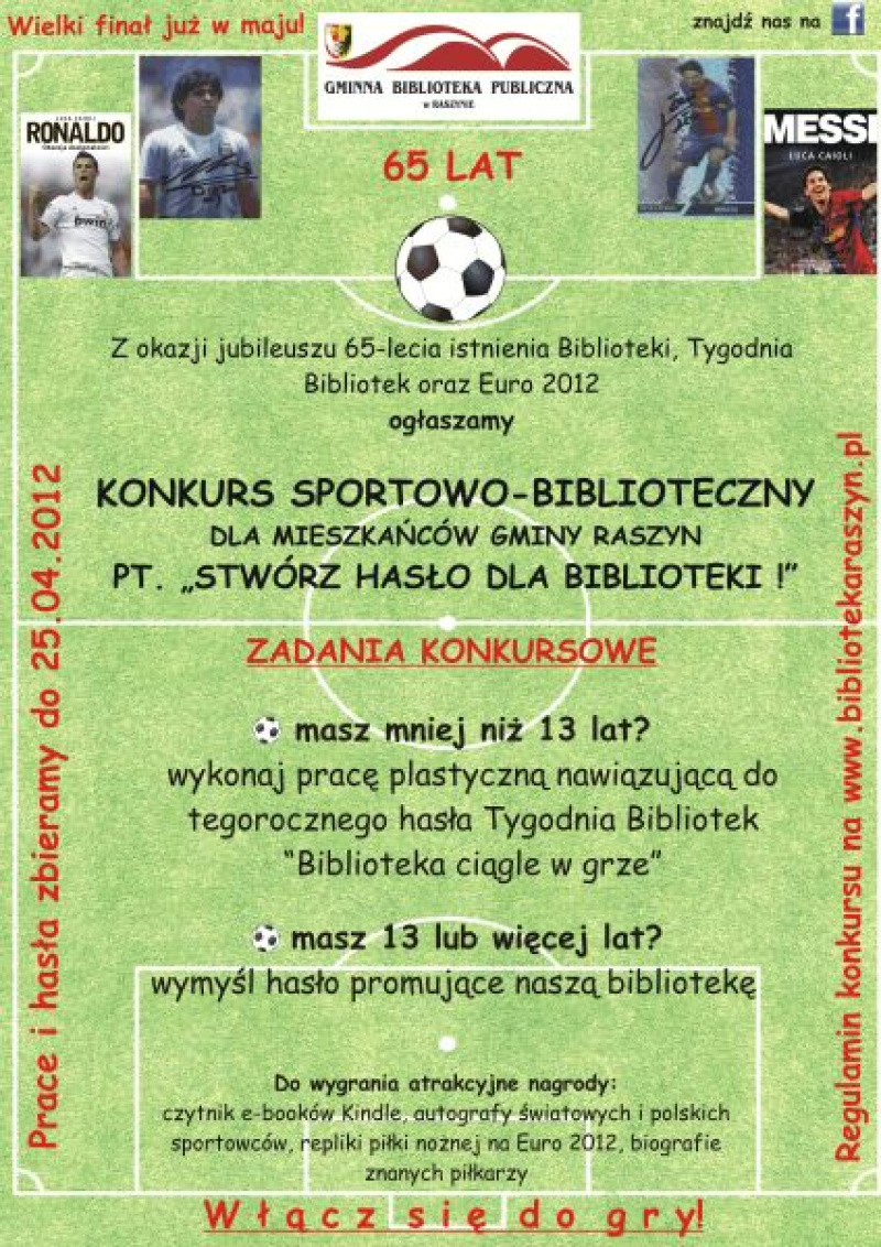 Następnym naszym krokiem był biblioteczno-sportowy konkurs dla mieszkańców naszej Gminy. Zadaniem było wymyślenie hasła promującego naszą bibliotekę. Ale żeby nie było tak łatwo, hasło miało też nawiązywać do sportu. Młodsi uczestnicy zostali poproszeni o wykonanie prac plastycznych, ilustrujących tegoroczne hasło Tygodnia Bibliotek (czyli „Biblioteka ciągle w grze”). Nasi mieszkańcy stanęli na wysokości zadania – i naszym nowym hasłem bibliotecznym jest obecnie „Biblioteka – Liga Mistrzów Literatury”.