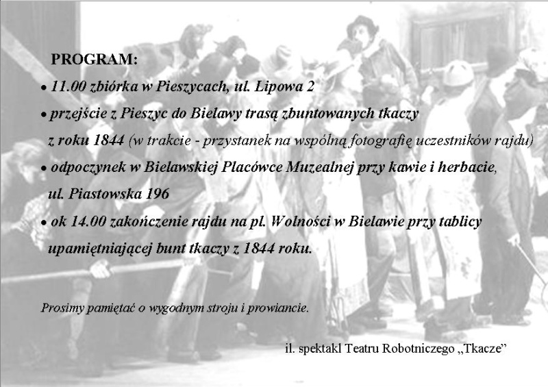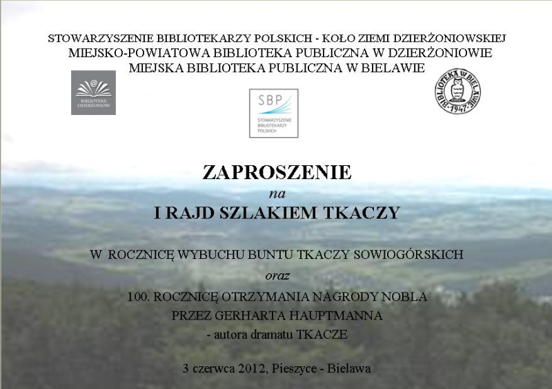 Zapraszamy 3 czerwca 2012 r. na I Rajd bibliotekarzy szlakiem buntu tkaczy z 1844 r. Zbiórka o 11.00 w Pieszycach, ul. Lipowa 2