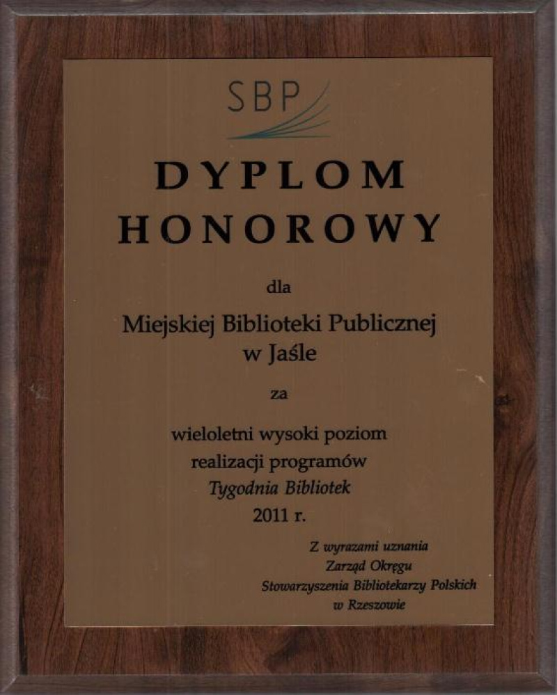 13 czerwca 2012 r. w Miejskiej Bibliotece Publicznej w Jaśle w trakcie III. Konferencji dyrektorów bibliotek powiatowych, pełniących funkcje powiatowe i miejskich zlokalizowanych w siedzibach powiatów „Kształtowanie wizerunku biblioteki” odbyło się uroczyste wręczenie odznaczeń Stowarzyszenia Bibliotekarzy Polskich oraz nagród laureatom konkursu na najlepiej zrealizowany program Tygodnia Bibliotek 2011 w woj. podkarpackim.