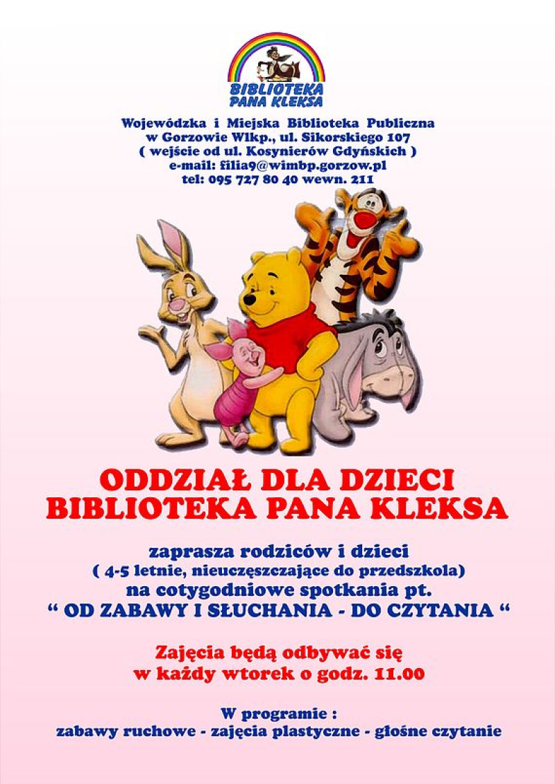 Zajęcia dla dzieci nieuczęszczających do przedszkola oraz ich opiekunów odbywają się w każdy wtorek o godzinie 11.00 w Oddziale Dziecięcym Wojewódzkiej i Miejskiej Biblioteki Publicznej im. Zbigniewa Herberta w Gorzowie Wielkopolskim.