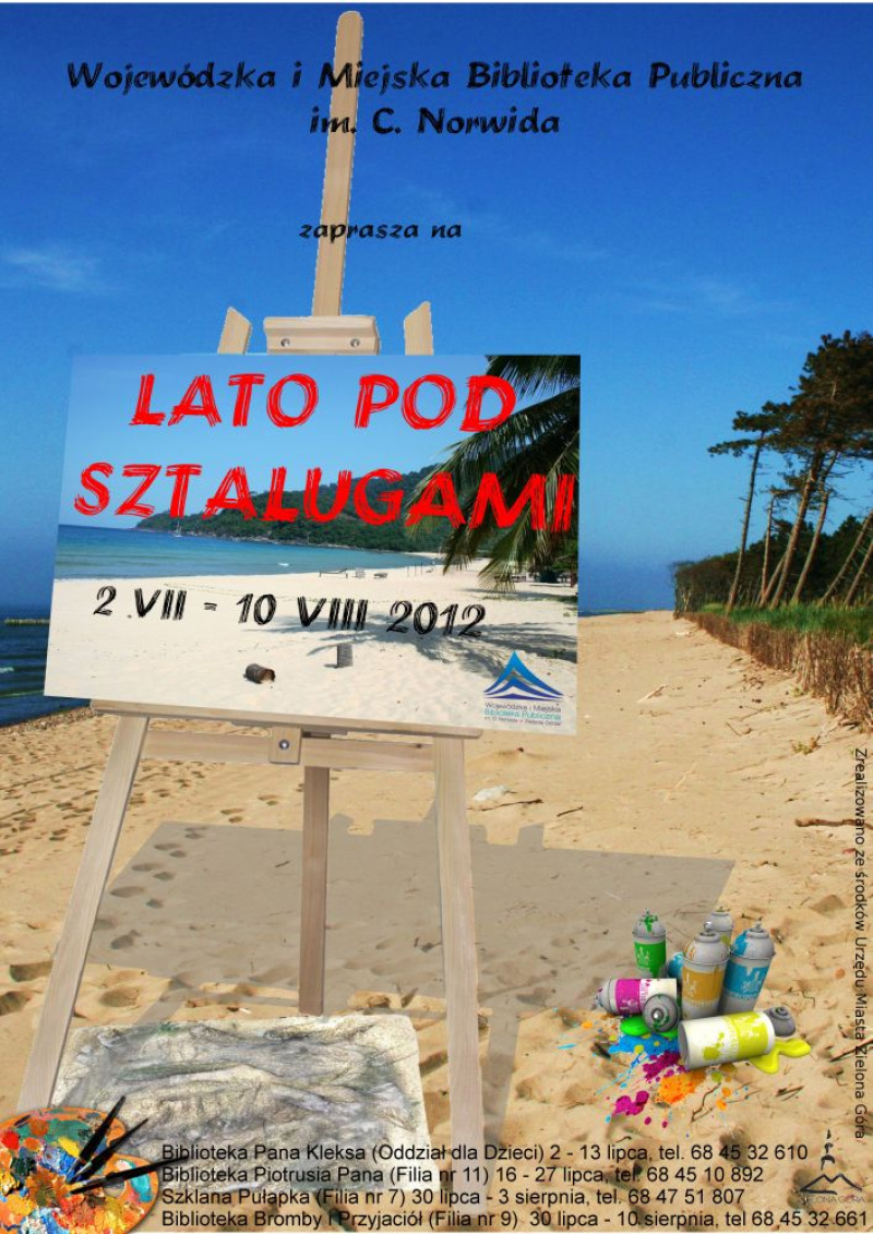 Uwaga! Organizatorzy zajęć proszą o wcześniejsze zapisywanie się (telefonicznie lub osobiście) na wybrane zajęcia. Wszystkie zajęcia są bezpłatne. Zajęcia wakacyjne Wakacje pod sztalugami organizowane przez Wojewódzką i Miejską Bibliotekę Publiczną im. C. Norwida finansowane są ze środków Urzędu Miasta Zielona Góra.