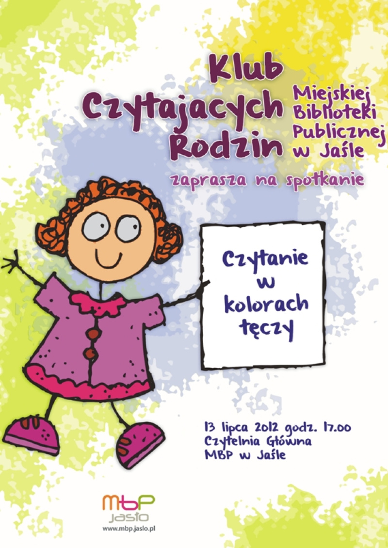 13 lipca 2012 r. o godz. 17:00 Klub Czytających Rodzin Miejskiej Biblioteki Publicznej w Jaśle zaprasza na spotkanie pod hasłem „Czytanie w kolorach tęczy”. Jak na wakacyjną porę przystało, w Klubie nie zabraknie kolorów i aktywności. Uczestnicy z pomocą chusty i tunelu animacyjnego przeniosą się w pełen barw świat wyobraźni, sprawdzą swoją zwinność, szybkość i zdolności manualne. Zgodnie z klubową tradycją będzie także okazja do poczytania wartościowej literatury i do zapoznania się z wakacyjnymi nowościami książkowymi w Oddziale dla Dzieci.