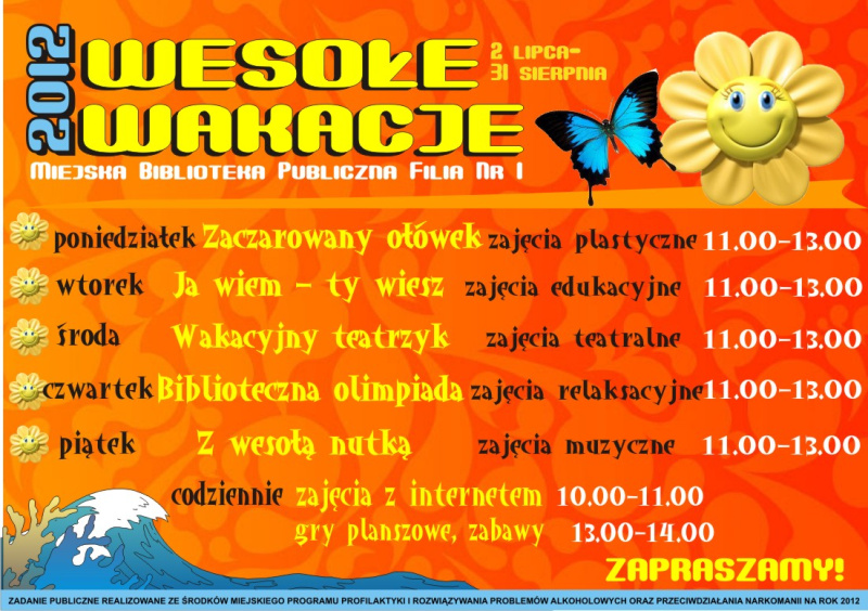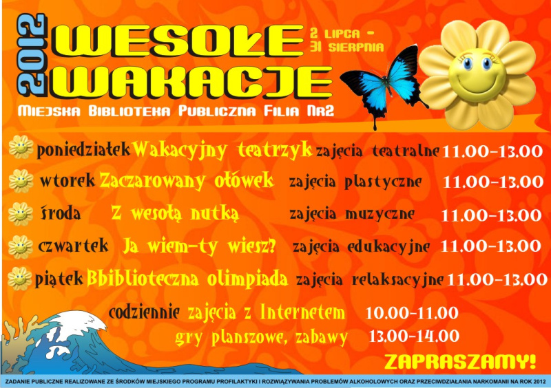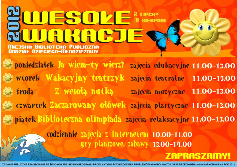 Miejska Biblioteka Publiczna w Kraśniku na wakacje dla dzieci przygotowała wiele atrakcji dzięki pozyskaniu środków z Miejskiego Programu Rozwiązywania Problemów Alkoholowych i Przeciwdziałaniu Narkomanii. Celem programu wakacyjnego w MBP to realizacja projektów służących zdrowemu stylowi życia, przeciwdziałanie uzależnieniom i patologiom społecznym tj. alkoholizmowi, narkomanii itp., oraz biernym formom spędzania czasu wolego.Celem programu wakacyjnego jest propagowanie zdrowego stylu życia, kształtowanie postaw abstynenckich i przeciwdziałanie narkomanii wśród dzieci i młodzieży. Bibliotece rozpocznie się 2 lipca godz. 16.00 piknikiem rodzinnym Lato, lato, lato czeka...... w ogrodzie MBP ul. Koszarowa 10A.