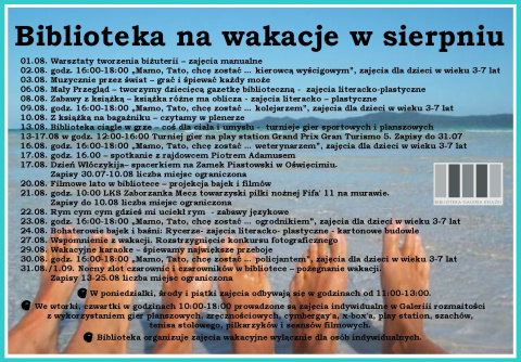 Zapraszamy do Biblioteki GALERII KSIĄŻKI na wakacyjne zajęcia codziennie (oprócz sobót) w godzinach od 11.00 – 13.00. Przypominamy, że szczegółowe propozycje spotkań wakacyjnych znajdują się na naszej stronie internetowej oraz na plakatach wydanych przez Urząd Miasta.