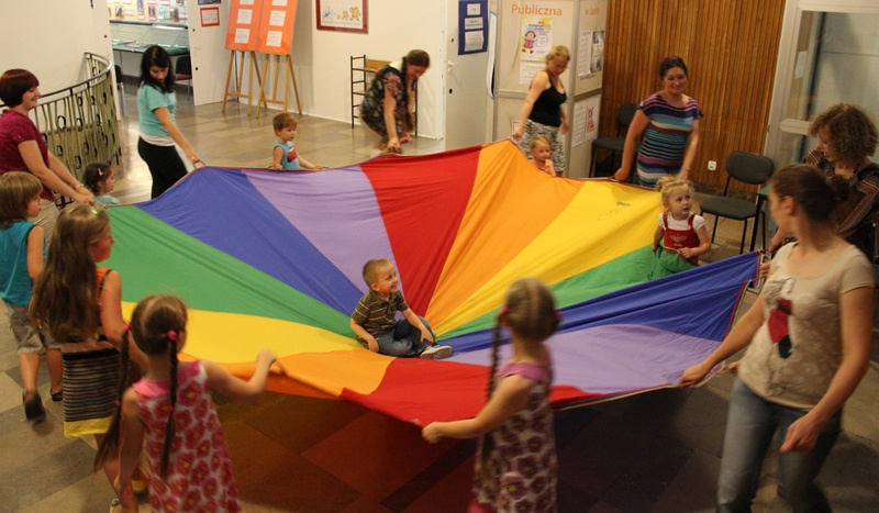 Mimo deszczowej pogody lipcowe spotkanie Klubu Czytających Rodzin Miejskiej Biblioteki Publicznej w Jaśle nie było wcale szare i pochmurne. Wszystko za sprawą kolorowych książek, tęczowych barw tunelu i chusty animacyjnej a przede wszystkim uśmiechniętych buzi dzieci.