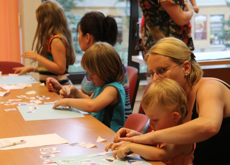 Spotkanie rozpoczęło się tradycyjnym głośnym czytaniem. Tym razem roli narratorki podjęła się Julitka, która świetnie poradziła sobie z wcale niełatwą historią kameleona z Tinga Tinga (Dlaczego kameleon zmienia kolor, tłum. Małgorzata Kochańska, Warszawa, Wyd. Wilga, 2012 – książka z serii Opowieści z Tinga Tinga, inspirowanej tradycyjnymi afrykańskimi opowiadaniami o zwierzętach). Powstały także morskie wyklejanki, pełne wielobarwnych stworzeń mieszkających w błękitnej wodzie. Później, na przekór pogodzie mali klubowicze z pomocą rodziców przenieśli się w krainę kolorów tęczy, wędrując przez tunel animacyjny i chowając się pod płachtą chusty. Na koniec chusta zamieniła się w kolorową karuzelę, w której w rytm piosenki śpiewanej niestrudzenie przez Olę zakręciły się wszystkie dzieci uczestniczące w spotkaniu, nawet najmłodsze Ania i Lenka. Po raz kolejny mali i dorośli członkowie Klubu udowodnili, że rodzinne czytanie i wspólna zabawa to recepta na każdą pogodę.