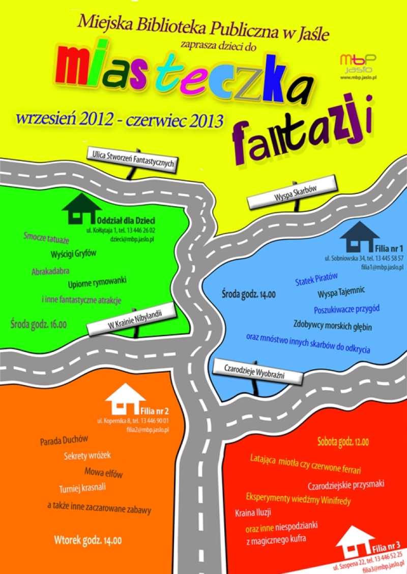 Cykl spotkań Miasteczko Fantazji, to okazja do tego, by rozwijać swą wyobraźnię i umilić chwile poświęcone zdobywaniu wiedzy. Od września 2012 do czerwca 2013 zapraszamy do udziału w zajęciach, podczas których każde dziecko spotka się z niecodzienną przygodą owianą nutką fantazji oraz wypełnioną czarodziejskimi zabawami. Do udziału w nich zachęcamy dzieci w wieku 6 – 10 lat. Towarzyszyć im będzie mnóstwo uśmiechu i dobrego humoru, z którymi odwiedzający nietypowe miejsce na pewno nie rozstaną się przez długi czas. Już niebawem do miasteczka zawitają: zdobywcy morskich głębin, piraci, elfy, wróżki, trolle oraz wielu innych fantastycznych bywalców, znanych z książek dla dzieci. Będzie okazja, by wystartować w wyścigach Gryfów, wziąć udział w paradzie duchów, eksperymentować z wiedźmą Winifredą i dowiedzieć się, jak przyrządza się czarodziejskie przysmaki. Mali uczestnicy bibliotecznego Miasteczka wkroczą także do krainy iluzji, poznając magiczne triki i na wzór lubianych stworzeń ziejących ogniem, wykonają niepowtarzalne, smocze tatuaże.