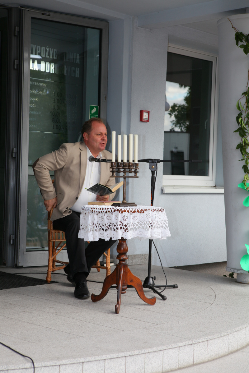 W sobotnie popołudnie od godziny 16.00, w taki dworek z Soplicowa zamienił się budynek Biblioteki w Wieluniu. Kolumny przy wejściu do budynku ozdobiono kolorowymi malwami i zieloną winoroślą. Podest biblioteki stał się w werandą dworku, na której wybrane fragmenty poematu wśród czerwonych pelargonii czytali: franciszkanin Ojciec Igor, dziennikarz Pan Waldemar Kozera, aktor z Koła Teatralnego działającego przy MiGBP w Wieluniu Pan Marek Berger. Akcję „Narodowego czytania Pana Tadeusza” w Wieluniu zakończył Epilog w wykonaniu Burmistrza Wielunia Pana Janusza Antczaka.