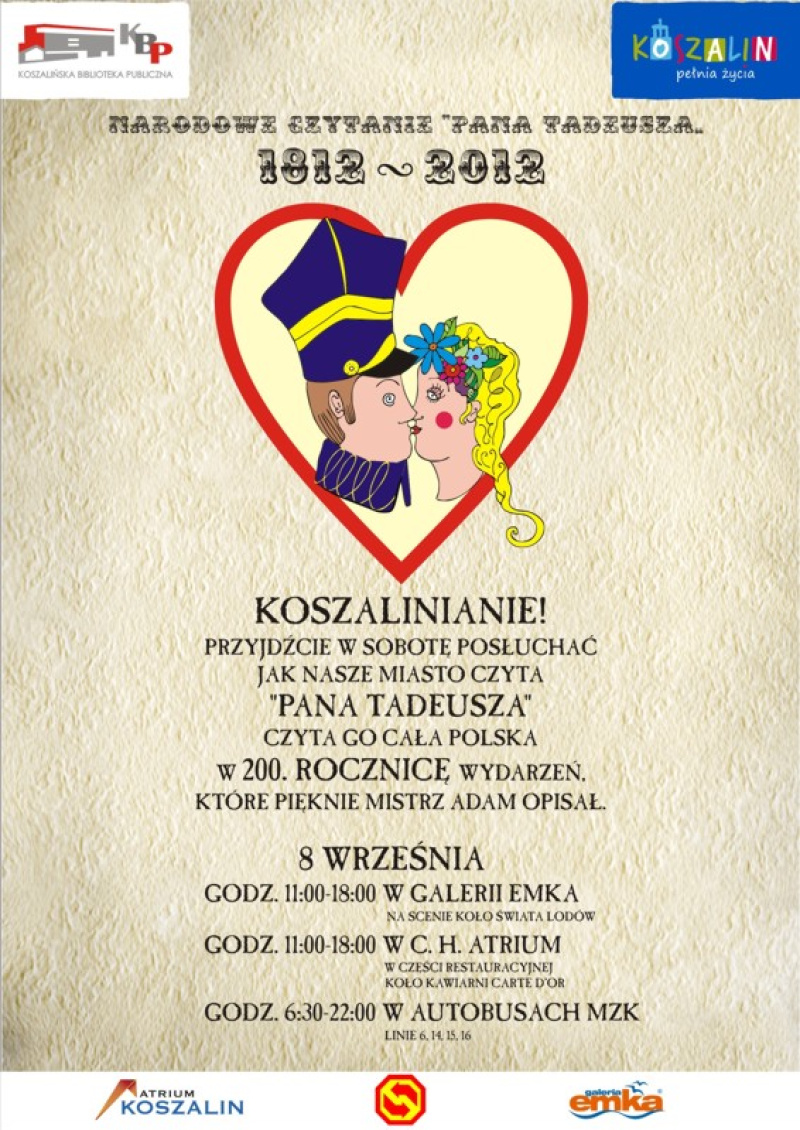 Otwarcia akcji w Galerii EMKA dokonał z-ca Prezydenta Koszalina Tomasz Sobieraj oraz Dyrektor KBP Andrzej Ziemiński. Czytanie rozpoczął Tomasz Sobieraj, następnie fragment epopei czytał radny Artur Wiśniewski, a po nim do czytania włączyli się uczniowie i nauczyciele koszalińskich liceów.