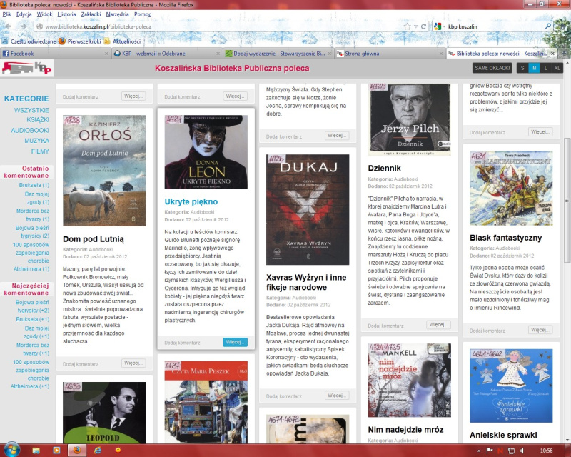 Kilka dni temu została uruchomiona nowa funkcja na stronie WWW Koszalińskiej Biblioteki Publicznej. Został opracowany nowy mechanizm prezentujący nabytki. Aby skorzystać z tego swoistego serwisu społecznościowego, najpierw wchodzimy na naszą stronę. Po prawej stronie tuż pod blokiem z katalogami on-line pojawił się nowy zielony moduł. W module tym przewija się 50 ostatnio wprowadzonych pozycji - w losowej kolejności. Po kliknięciu przenosimy się w inny wymiar… UWAGA: mechanizm ten działa na wszystkich nowoczesnych przeglądarkach, ale najbardziej oszołamiająco prezentuje się w Google Chrome.