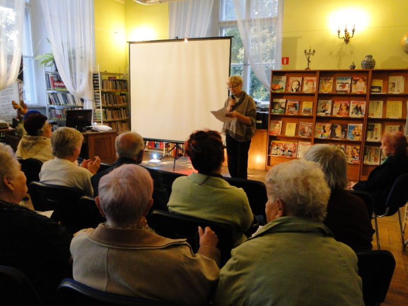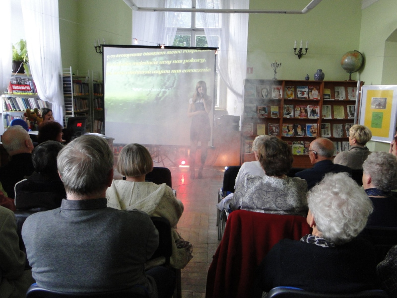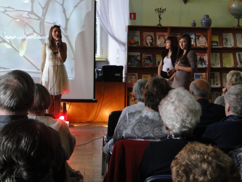 Wieczór rozpoczęła słowami powitania Magdalena Śliwak – Dyrektor MBP, która przedstawiła też cały program przewidziany na obchody Tygodnia Seniora w Żaganiu. Miłą niespodzianką i prezentem dla Seniorów był montaż słowno-muzyczny przygotowany przez młodzież Zespołu Szkół Tekstylno-Handlowych. Uczniowie, a nawet absolwenci nie tylko upiększyli spotkanie, ale zachwycili obecnych swoimi talentami artystycznymi. Przygotowali się bardzo solidnie. Zadbali nie tylko o dobór tekstów, ale i o nastrój instalując kolorowe oświetlenie. Dym też był. Na chwilę Czytelnia dzięki nim zamieniła się w małą estradę. I to wszystko dla naszych Seniorów.