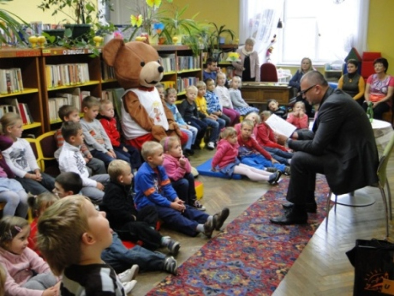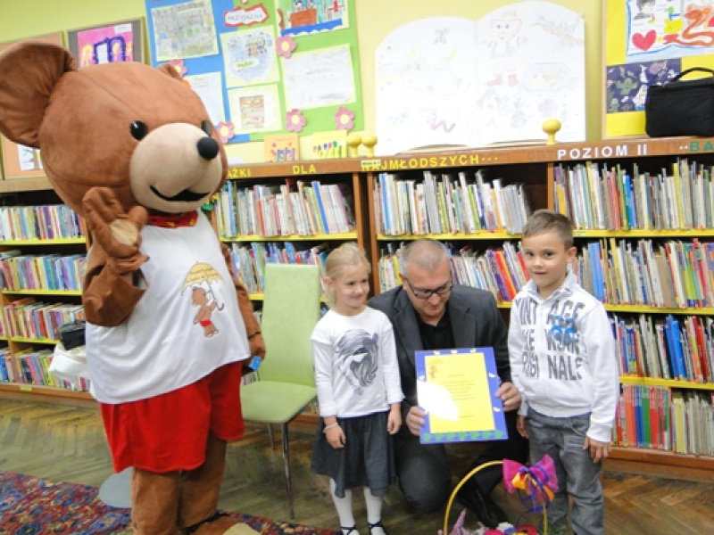 W piątek 21 września 2012 roku w naszej Bibliotece urodziny obchodził Miś Uszatek. Przybyło wieku gości z Miejskiego Przedszkola Nr 5 imienia Czesława Janczarskiego w Żaganiu, ale największą niespodzianką było przybycie Burmistrza Miasta Sławomira Kowala. Nasz Honorowy Gość przeczytał opowiadania z książki Wędrówki Misia Uszatka. Zebrani goście bardzo życzliwie przyjęli Pana Burmistrza, z uwagą i w skupieniu słuchali czytanych opowiadań, a dowodem na to była niekończąca się lawina pytań. Wszyscy bawili się znakomicie. A Miś Uszatek był bardzo szczęśliwy, pewnie nie spodziewał się tylu niespodzianek. Na zakończenie Pan Burmistrz wręczył słodkie upominki. Spotkanie z włodarzem naszego miasta na długo pozostanie w pamięci . To były udane urodziny!!!