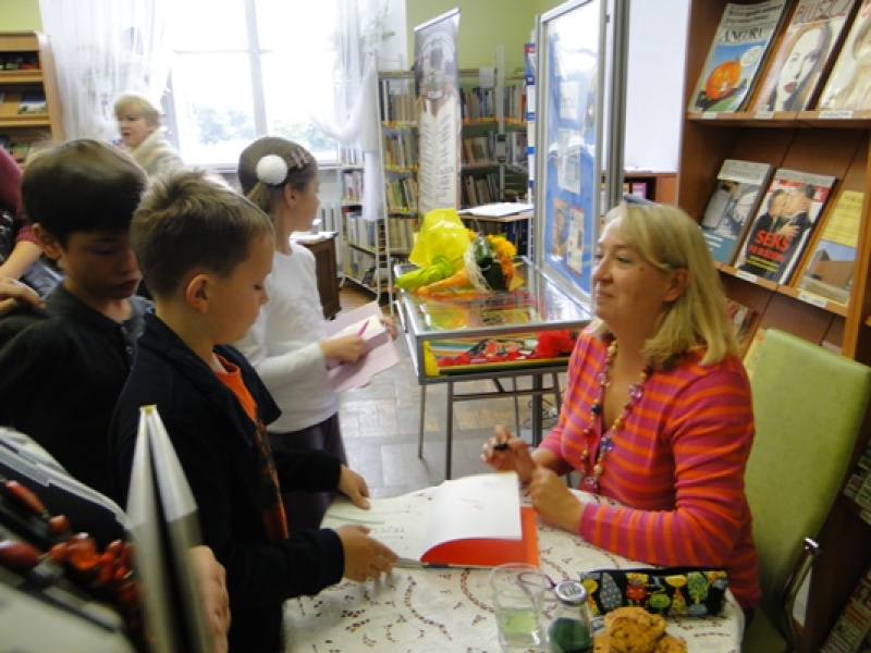 Na spotkaniu autorka czytała fragmenty swoich książek i opowiadała, jak wielką frajdę sprawia jej zabawa językiem polskim. Dla dzieci kontakt z pisarką był ciekawą lekcją, a co najważniejsze wywołał uśmiech na ich małych buziach. Na zakończenie spotkania każde dziecko mogło kupić książkę i otrzymać autograf. Dziękujemy za spotkanie.J
