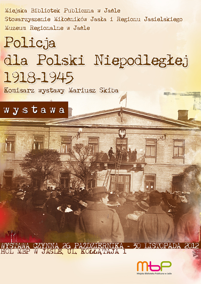 Miejska Biblioteka Publiczna w Jaśle, Stowarzyszenie Miłośników Jasła i Regionu Jasielskiego, Muzeum Regionalne w Jaśle oraz Komisarz wystawy Mariusz Skiba zapraszają na otwarcie wystawy „Policja dla Polski Niepodległej 1918-1945”, które odbędzie się 26 października 2012 r. o godz. 17.00 w Czytelni Głównej MBP w Jaśle. W programie przewidziane są referaty: Kamila Ruszały o sytuacji w naszym powiecie w 1918 r., w kontekście odradzania się polskiej państwowości oraz Mariusza Skiby o aspektach policyjnej służby, w Polsce Niepodległej.