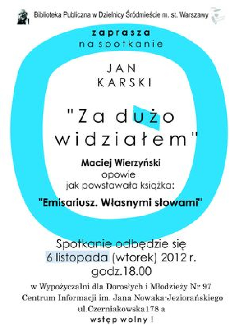 W dniu 6 listopada 2012 roku o godzinie 18:00 w Centrum Informacji im. Jana Nowaka - Jeziorańskiego, Biblioteka Publiczna w Dzielnicy Śródmieście m.st. Warszawy zaprasza na spotkanie z Maciejem Wierzyńskim - gospodarzem programu Horyzont w telewizji TVN24 pt. „Emisariusz. Własnymi słowami”. Jak powstawał wywiad – rzeka z JANEM KARSKIM.