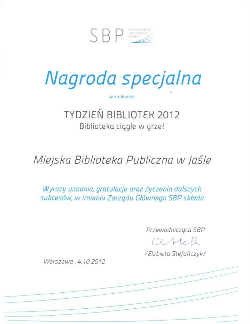 4 października 2012 r. odbyły się obchody jubileuszu 95.lecia Stowarzyszenia Bibliotekarzy Polskich. Podczas uroczystej gali wręczone zostały odznaczenia i nagrody dla zasłużonych bibliotek i bibliotekarzy. Wśród wyróżnionych instytucji znalazła się Miejska Biblioteka Publiczna w Jaśle, która otrzymała nagrodę specjalną w konkursie na najlepiej zorganizowany Tydzień Bibliotek 2012 – Biblioteka ciągle w grze!