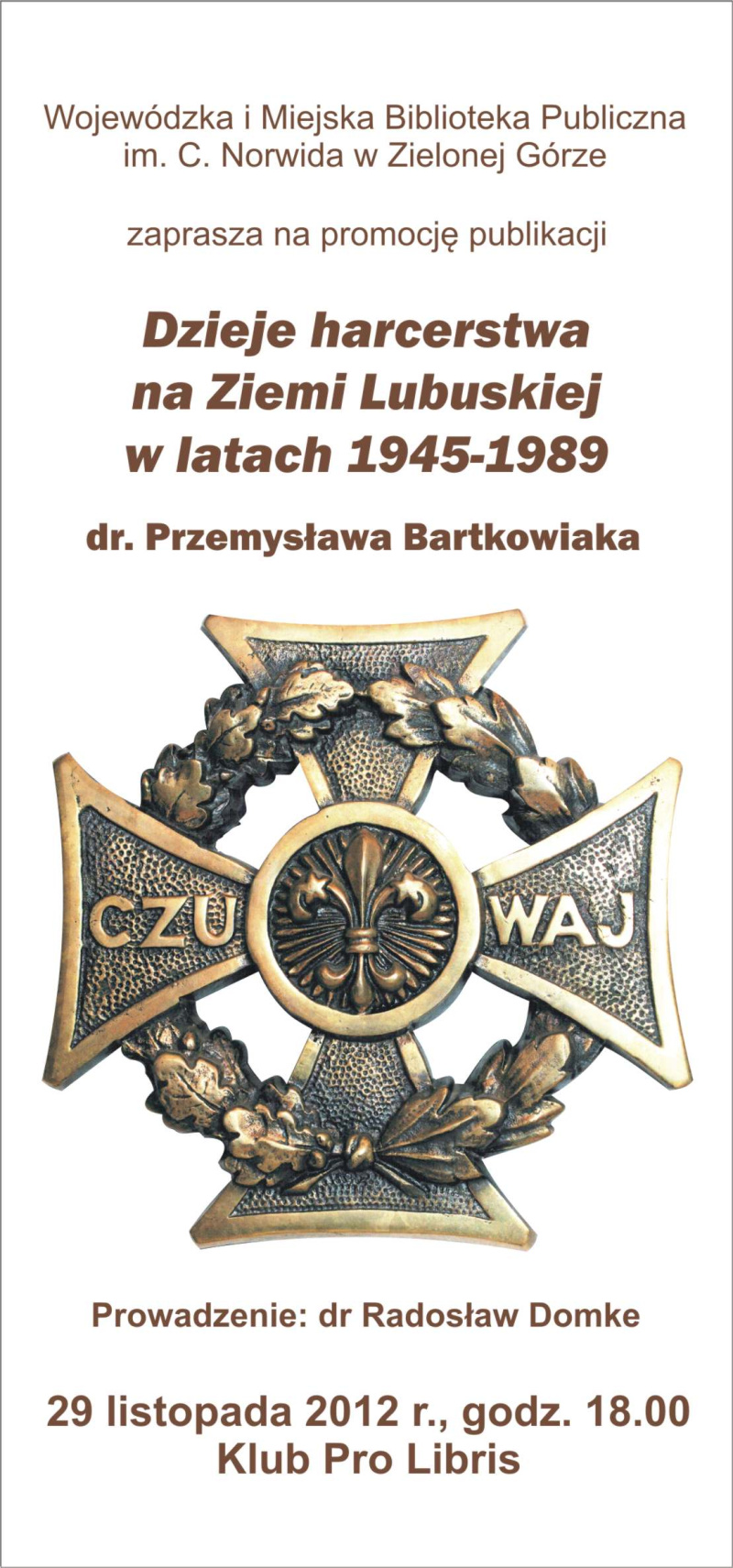 Wojewódzka i Miejska Biblioteka Publiczna im. C. Norwida w Zielonej Górze zaprasza 29 listopada br. o godz. 18.00 do Klubu Pro Libris na promocję publikacji Dzieje harcerstwa na Ziemi Lubuskiej w latach 1945-1989 dr. Przemysława Bartkowiaka.