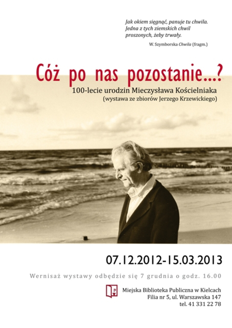 „Cóż po nas pozostanie…?” to tyłuł wystawy poświęconej Mieczysławowi Kościelniakowi, który urodził się w styczniu 1912 r. w Kaliszu. Co pozostało po tym niezwykłym artyście, uczniu Józefa Mehoffera, ocalałym więźniu Oświęcimia? Obrazy, rysunki, ilustracje książkowe, fotografie, listy, wspomnienia przyjaciół i ich pamięć.