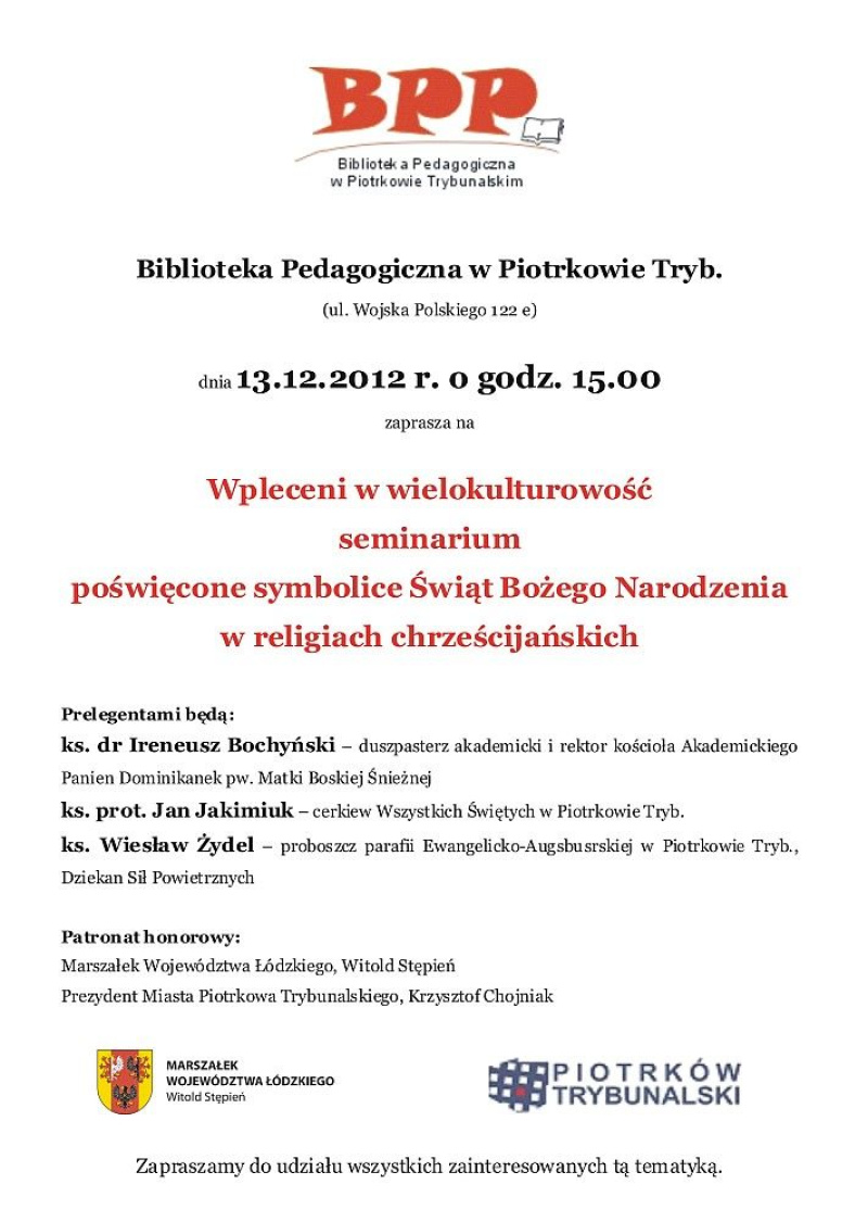 13 grudnia 2012 roku o godzinie 15.00 Biblioteka Pedagogiczna w Piotrkowie Trybunalskim zaprasza na seminarium Wpleceni w wielokulturowość poświęcone symbolice Świąt Bożego Narodzenia w religiach chrześcijańskich.