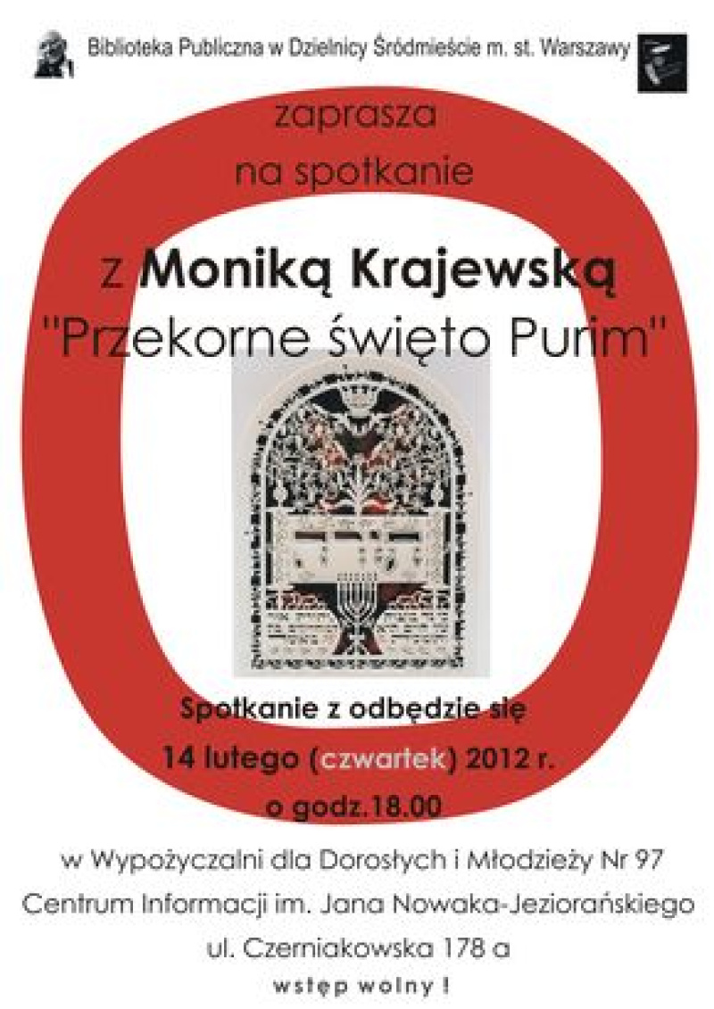 zaprasza 14 lutego 2013r. godz. 18:00, do Centrum Informacji im. Jana Nowaka-Jeziorańskiego ul. Czerniakowska 178a, na spotkanie z Moniką Krajewską która opowie o żydowskim święcie Purym.