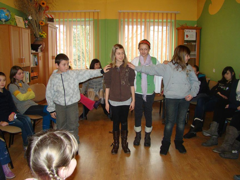 Zajęcia z dramy, to bliskie spotkania ze sztuką, a w szczególności z teatrem. Młodzi czytelnicy w praktyce mogli poznać ile pracy zajmuje przygotowanie spektaklu, sami bowiem tworzyli scenariusz, dekorację, stroje i charakteryzację do przedstawienia, które później zostało zaprezentowane publiczności na zajęciach w bibliotece. Ćwiczenia różnorodnych technik dramowych pod fachowym okiem Katarzyny Krawiec- aktorki i animatora scen dziecięcych zmobilizowały do współpracy całą trzydziestoosobową grupę dzieci. W trakcie zajęć nikt nie został pominięty i każdy uczestnik musiał na równi zaangażować się we współpracę. Młodzi aktorzy z zapałem ćwiczyli wyobraźnię, która pozwala odkryć samego siebie, otaczający świat, uczy przewidywać sytuacje, uwrażliwia na przyrodę, ułatwia wczucie się w emocje i uczucia innych, a dzięki temu uczy empatii i odpowiedzialności.