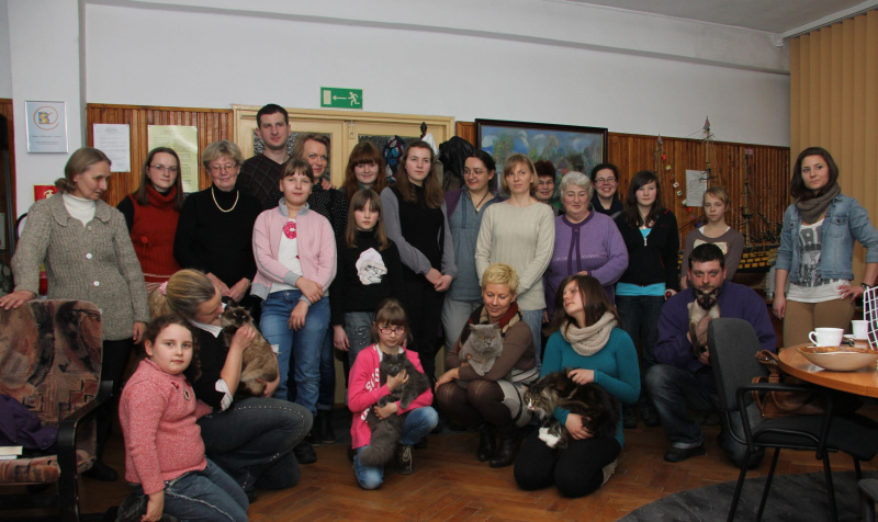Temu wszystkiemu przyglądała się - z mniejszą lub większą uwagą - „kocia arystokracja”: Kleo - kot syberyjski, Gizmo – maine coon, Dastin – brytyjski niebieski, Mieczysław - kot syjamski oraz Leon - krzyżówka maine coona z persem. Mieczysław - najodważniejszy i najbardziej ciekawski - przemierzył wszystkie możliwe biblioteczne zakątki. Leon „przytulanka”- wędrował z rąk do rąk uszczęśliwionych, nie tylko najmłodszych, wielbicieli „felis catus”. Jedynie Dastin spoglądał niepewnie, czy też może z wyższością, i nie zamierzał opuszczać swojego „domku”.To co miłe szybko się kończy. „Kociarze” planują już następne spotkanie. Niekoniecznie „kocie”, gdyż większość z nich jest jeszcze szczęśliwymi posiadaczami psów, ptaków, rybek akwariowych…