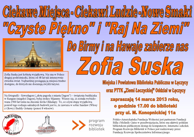 Zapraszamy na spotkanie "Czyste piękno i raj na ziemi", na którym pani Zofia Suska , zabierze nas do Birmy i na Hawaje. Spotkanie rozpocznie się 14 marca 2013 r. o godzinie 17.00 w MiPBP w Łęczycy. Realizujemy je w ramach projektu „Ciekawe miejsca – Ciekawi ludzie – Nowe smaki” czyli cykl spotkań z podróżnikami. Poznamy te ciekawe miejsca również przez degustację charakterystycznych dla nich przekąsek. Projekt jest realizowany wspólnie z PTTK „Ziemia Łęczycka”.