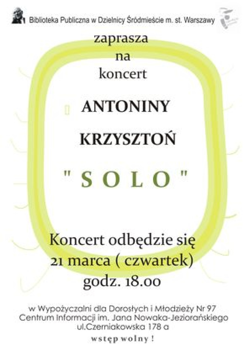 na koncert Antoniny Krzysztoń – piosenkarki, kompozytorki i autorki tekstów. Jej twórczość jest zaliczana do nurtu poezji śpiewanej. Poza własnymi tekstami opracowywała też wiersze Zbigniewa Herberta i piosenki czeskiego barda Karela Kryla.