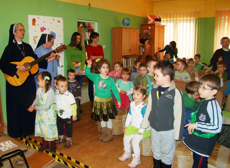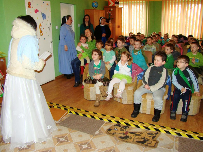 Na zakończenie spotkania dzieci z opiekującymi się nimi Siostrami zaśpiewały wiosenne piosenki zwiastujące zbliżające się Święta Wielkanocne i czas odrodzenia w przyrodzie wszelkich zwierząt, zarówno tych dużych i jak tych małych.