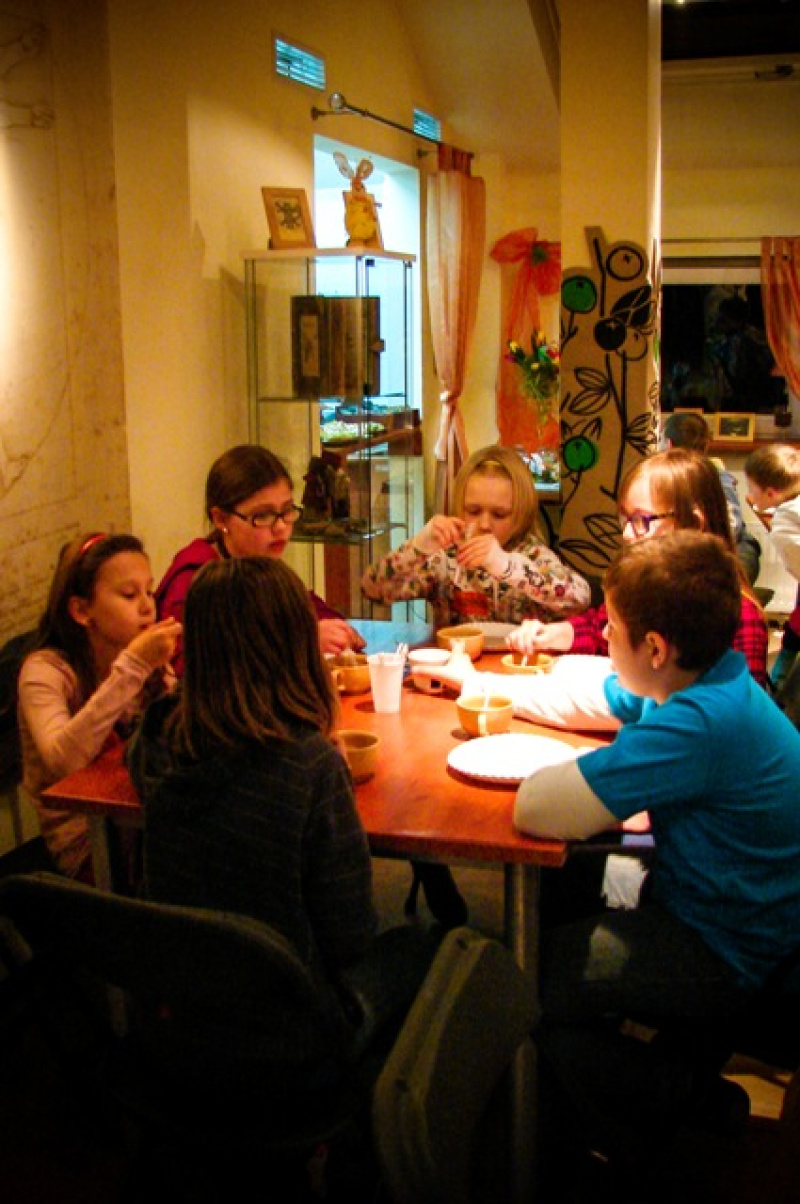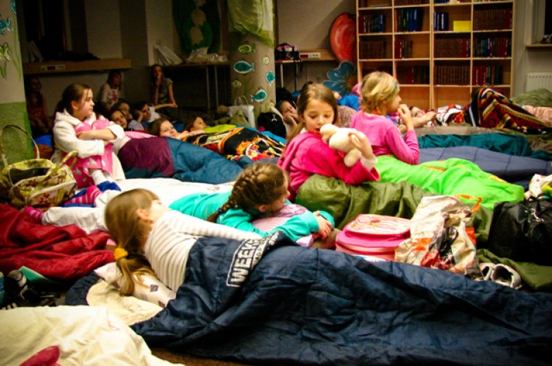 Po emocjonujących spotkaniach uczestników imprezy zaproszono na pyszną kolację, którą przygotowali uczniowie Zespołu Szkól nr 2 im. Wojciecha Korfantego w Jastrzębiu-Zdroju. Dla małych łasuchów przygotowano wyśmienite naleśniki oraz kanapki. Po kolacji rozpoczęła się kolejna część wieczoru, wypełniona kreatywnymi i twórczymi zabawami. Młodzi czytelnicy brali udział w różnych konkurencjach w których musieli wykazać się wiedzą, często sprytem oraz szybkością i refleksem w wykonywaniu poleceń. Dużo radości sprawiła rozmowa z uczestnikami Nocy z Andersenem w Bibliotece w Lubinie za pośrednictwem Skype’a. Dzieci miały możliwość rozmowy z rówieśnikami i podzielenia się wrażeniami ze wspólnie spędzonego wieczoru. Przygotowano również słodką niespodziankę – wspaniały tort w kształcie książki. Uczestnicy mieli możliwość zaprezentowania talentu tanecznego podczas wspólnej zabawy przy muzycznych hitach, która trwała prawie do północy. O tej porze przyszedł czas na wieczorną toaletę i rozłożenie śpiworów. Nie był to jednak koniec imprezy. Ostatnim elementem był sens bajkowy. Ku zaskoczeniu organizatorów najbardziej wytrwali uczestnicy zasnęli dopiero ok. godziny 4 nad ranem. Mimo tego każdy bez problemu wstał o 7 rano na wspólne śniadanie. Dzieci zadowolone wracały do domów z myślą o kolejnej Nocy z Andersenem.