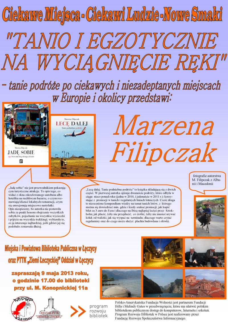 Zapraszamy na spotkanie "Tanio i egzotycznie na wyciągnięcie ręki", na którym pani Marzena Filipczak, zabierze nas w nieznane miejsca południowo wschodniej Europy. Spotkanie rozpocznie się 9 maja 2013 r. o godzinie 17.00 w MiPBP w Łęczycy. Realizujemy je w ramach projektu „Ciekawe miejsca – Ciekawi ludzie – Nowe smaki” czyli cykl spotkań z podróżnikami. Poznamy te ciekawe miejsca również przez degustację charakterystycznych dla nich przekąsek: ukraińskich rogalików, sałatki greckiej, chałwy oraz brzoskwiń i moreli. Projekt jest realizowany wspólnie z PTTK „Ziemia Łęczycka”.