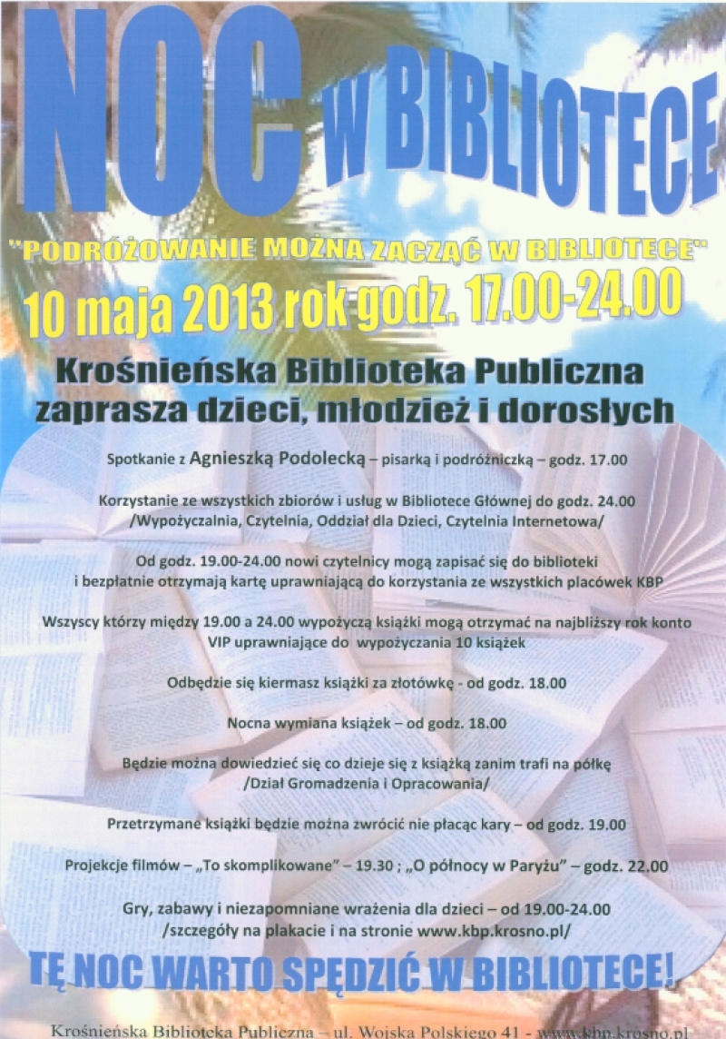 Od godz. 19.00 w bibliotece odbędzie się kiermasz książek za złotówkę, „nocna wymiana książek”, projekcje filmów oraz liczne gry i zabawy dla dzieci /szczegóły na plakatach/.