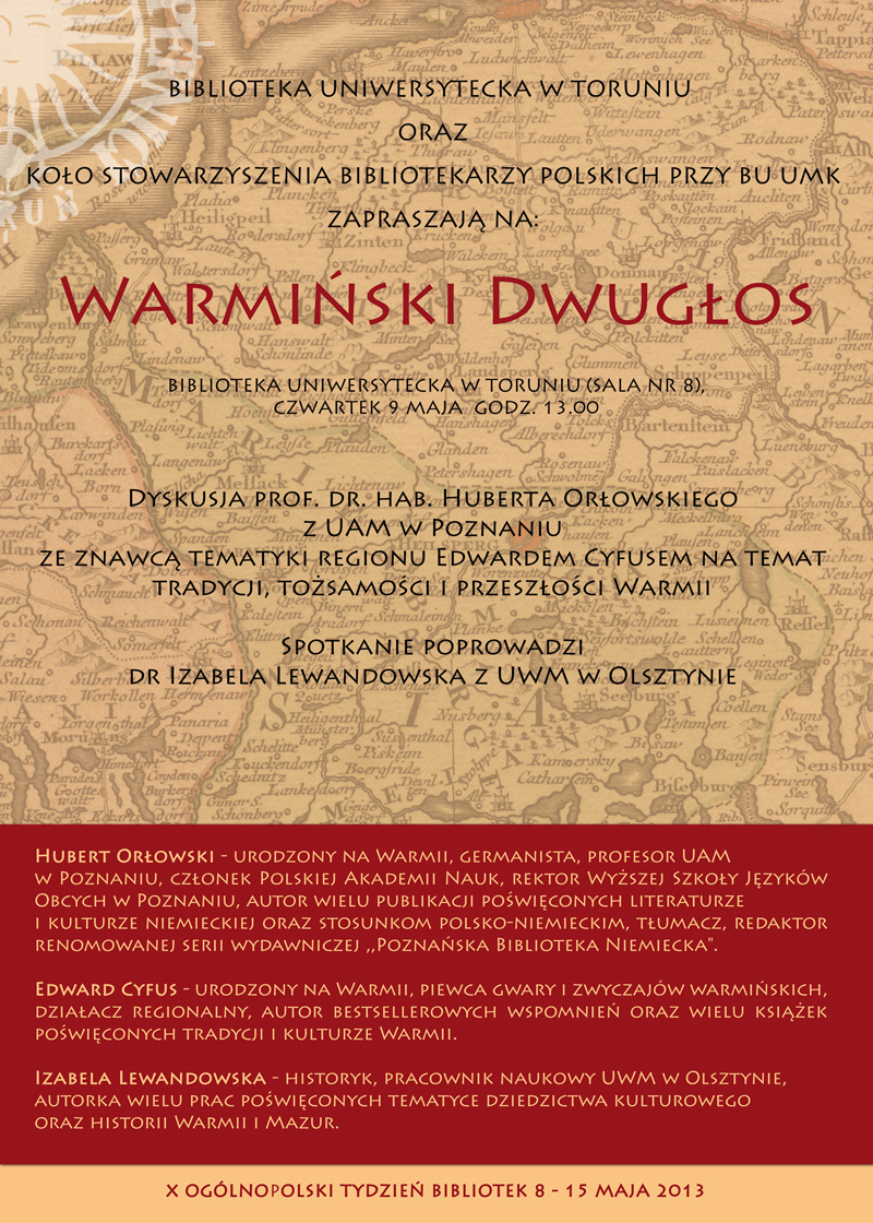 - Warmiński Dwugłos. Dyskusja prof. dr hab. Huberta Orłowskiego z UAM w Poznaniu ze znawcą tematyki regionu Edwardem Cyfusem na temat tradycji, tożsamości i przeszłości Warmii. Spotkanie poprowadzi dr Izabela Lewandowska z UWM w Olsztynie, godz.13.00 (sala nr 8)