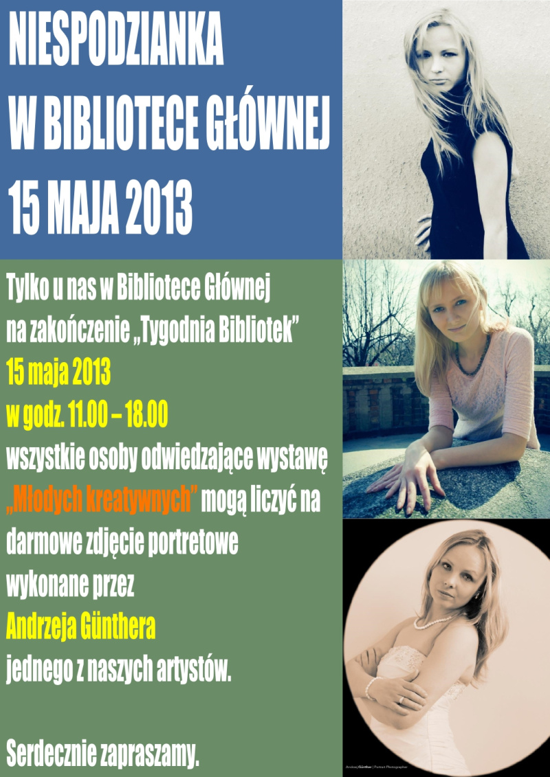 Wszyscy, którzy przyjdą na wystawę "Młodzi kreatywni" zorganizowaną z okazji Tygodnia Bibliotek w godzinach 11 - 18, będą mogli liczyć na darmowe zdjęcie portretowe wykonane przez artystę Andrzeja Gunthera.