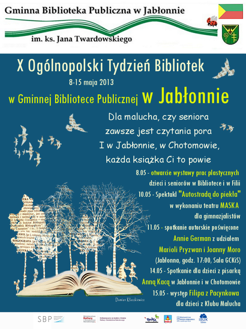 Obchody tegorocznego, dziesiątego już Ogólnopolskiego Tygodnia Bibliotek, odbywały się pod hasłem „Biblioteka przestrzenią dla kreatywnych”. Można by powiedzieć, że to, w jaki sposób wypełnić treścią tak ogólne hasło, zależało od kreatywności samych bibliotekarzy. W Gminnej Bibliotece Publicznej w Jabłonnie postanowiliśmy potraktować tegoroczne obchody jako okazję do pogłębienia integracji z lokalnym środowiskiem oraz szansę do przysłużenia się mu poprzez przygotowanie szeregu imprez, kierowanych do możliwie najszerszego grona odbiorców.