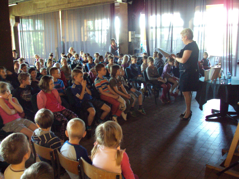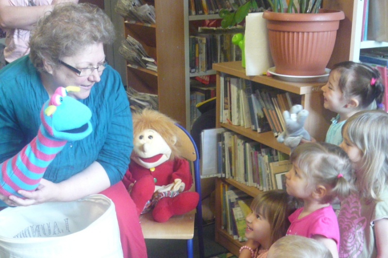 Aczkolwiek wieczór poświęcony Annie German był imprezą otwartą dla wszystkich, bez względu na wiek, to jednak nie da się ukryć, że z racji jego tematyki wzbudził on zainteresowanie głównie ludzi w kwiecie wieku. Jako instytucja publiczna pragnęliśmy jednak dotrzeć z naszą ofertą także do młodszych. Z myślą o nich przygotowaliśmy trzy imprezy: występ teatru MASKA dla gimnazjalistów, spotkanie z poetką dziecięcą i pedagogiem, panią Anną Kaca, na którym gościliśmy przedszkolaki i uczniów klas pierwszych szkoły podstawowej oraz, przygotowane specjalnie dla najmłodszych z Klubu Malucha sąsiadującego z nami Centrum Kultury, spotkanie z panią Małgorzatą Karasińską. Jak wiadomo imprezy dla najmłodszych wymagają innego podejścia organizacyjnego niż te kierowane do dorosłych. Chcąc uzyskać pożądaną frekwencję, nie można bowiem w ich wypadku ograniczać się jedynie do tradycyjnej promocji (plakaty, ulotki). W tym wypadku zaprocentowała, mająca kilkuletnią historię, współpraca z lokalnymi szkołami i przedszkolami, które z ochotą przyprowadziły swoich podopiecznych na organizowane przez nas imprezy. Tym bardziej, że organizując je mieliśmy na uwadze, oprócz dostarczenia rozrywki, także zapewnienie odpowiedniej wartości pedagogicznej. Spektakl przedstawiony przez młodych aktorów z teatru Maska, stanowił świetny przykład aktywnej profilaktyki antynarkotykowej. Spotkanie z Anną Kaca, pedagogiem z wykształcenia, łączyło w sobie dobrą zabawę z walorami edukacyjnymi. Natomiast pacynki za pomocą których pani Karasińska zabawiała maluchy, miały na celu budowanie wśród nich zainteresowania książkami i bibliotekami.