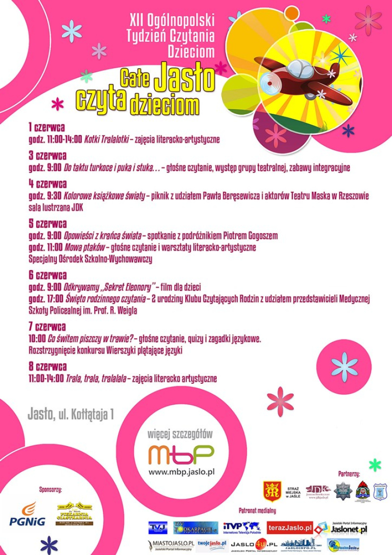 Tegoroczne hasło akcji, organizowanej już po raz dwunasty przez Fundację „ABCXXI Cała Polska czyta dzieciom”, w którą włącza się jasielska Biblioteka, brzmi „Czytanie dzieciom – najlepsza inwestycja”. Inspiracją do działań będzie twórczość Juliana Tuwima, która od pokoleń bawi i uczy najmłodszych czytelników. Dzieci wysłuchają głośnego czytania wierszy autora słynnej „Lokomotywy” w wykonaniu dorosłych, wezmą udział w kolorowym Dniu Dziecka w Tuwimolandii, pikniku z udziałem Pawła Beręsewicza i Teatru Maska z Rzeszowa oraz sprawdzą, co świtem piszczy w trawie. Święto czytania będzie także okazją do niecodziennych spotkań dzieci ze strażakami i policjantami, kreatywnych zajęć literacko-artystycznych z Panem Hilarym i Słoniem Trabalskim w roli głównej czy gier słownych z Zosią Samosią i Dyziem Marzycielem. Nie zabraknie również barwnych parad inspirowanych postaciami z wierszy Tuwima, projekcji filmu oraz zabaw z harcerzami i mnóstwa innych atrakcji, a wszystko po to, by zachęcić dzieci do czytania, a dorosłych przekonać, że wspólne, głośne czytanie dzieciom jest skuteczną i przyjazną metodą wspomagania ich wszechstronnego rozwoju – psychicznego, umysłowego, społecznego i moralnego - oraz budowania zasobów wewnętrznych dziecka: kompetencji emocjonalnych i intelektualnych.