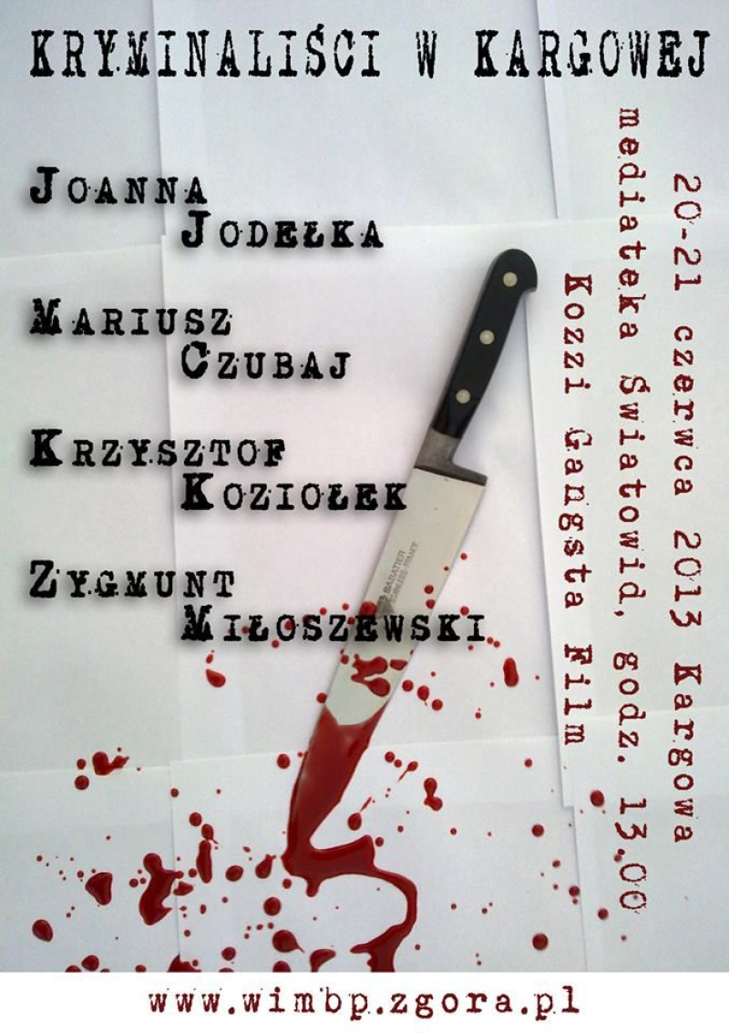 Wojewódzka i Miejska Biblioteka Publiczna im. C. Norwida w Zielonej Górze, Dyskusyjne Kluby Książki, Gminna Biblioteka Publiczna im. E. Paukszty w Kargowej organizują w dniach 20-21 czerwca br. w Kargowej (mediateka Światowid) seminarium kryminalne z udziałem: Joanny Jodełki, Mariusza Czubaja, Krzysztofa Koziołka i Zygmunta Miłoszewskiego. Impreza w ramach 2. Festiwalu Filmu i Teatru Kozzi Gangsta Film. Kargowa 2013 www.kozzigangsta.pl